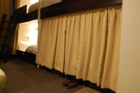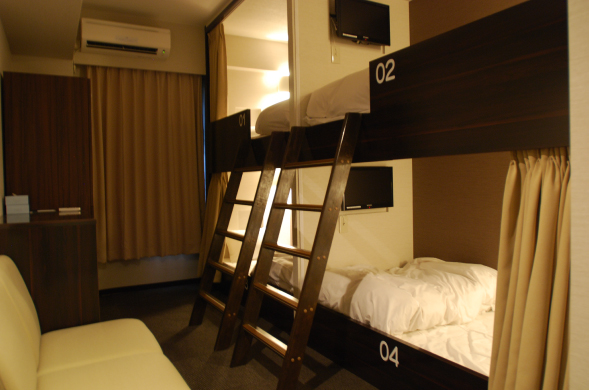 最大4人が共同で寝泊まりできる広さを確保し、室内には仕切りカーテン付きの2段ベッド2客を設置。それぞれに19インチ液晶テレビ、イヤホン、枕照明を完備します。また、単身者でも安心して泊まれるように、人数分の個人ロッカーを設けます。